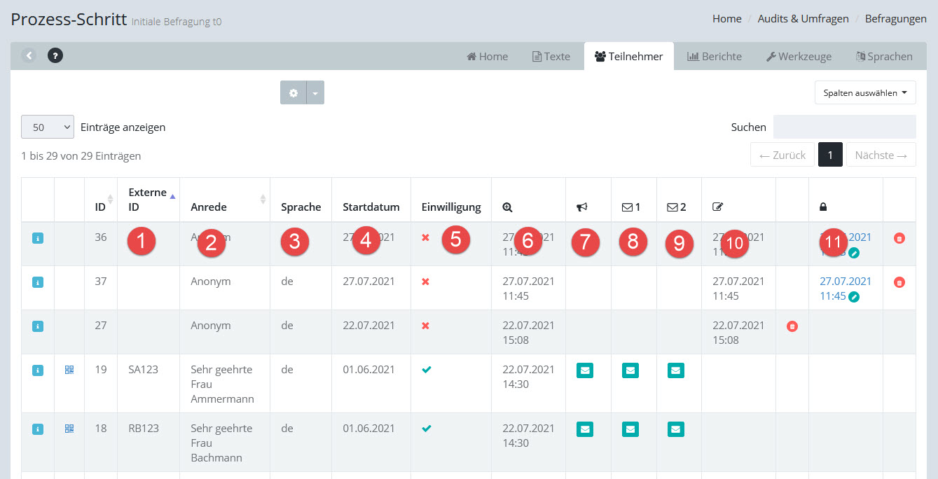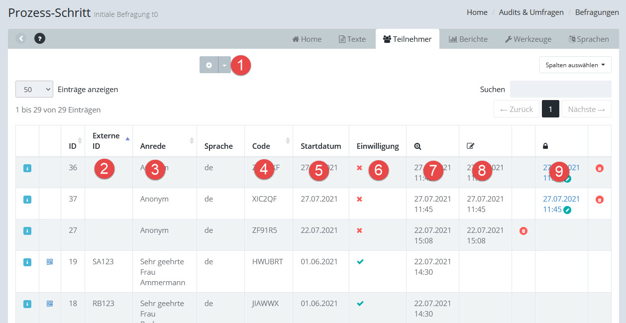 Prozess-Schritt einer Befragung: Teilnehmerliste bei Teilnahme durch E-Mail-Einladung