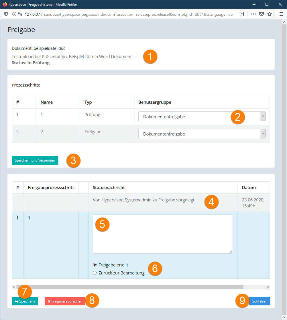 Durch Anklicken des Icons "Freigabe" öffnet sich der Freigabe-Dialog zum aktuellen Prozess-Schritt der Freigabe: