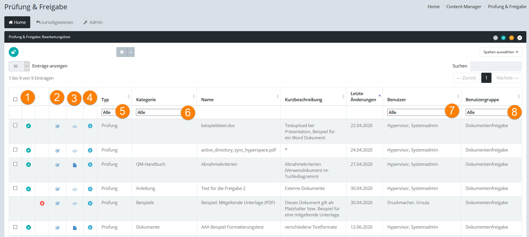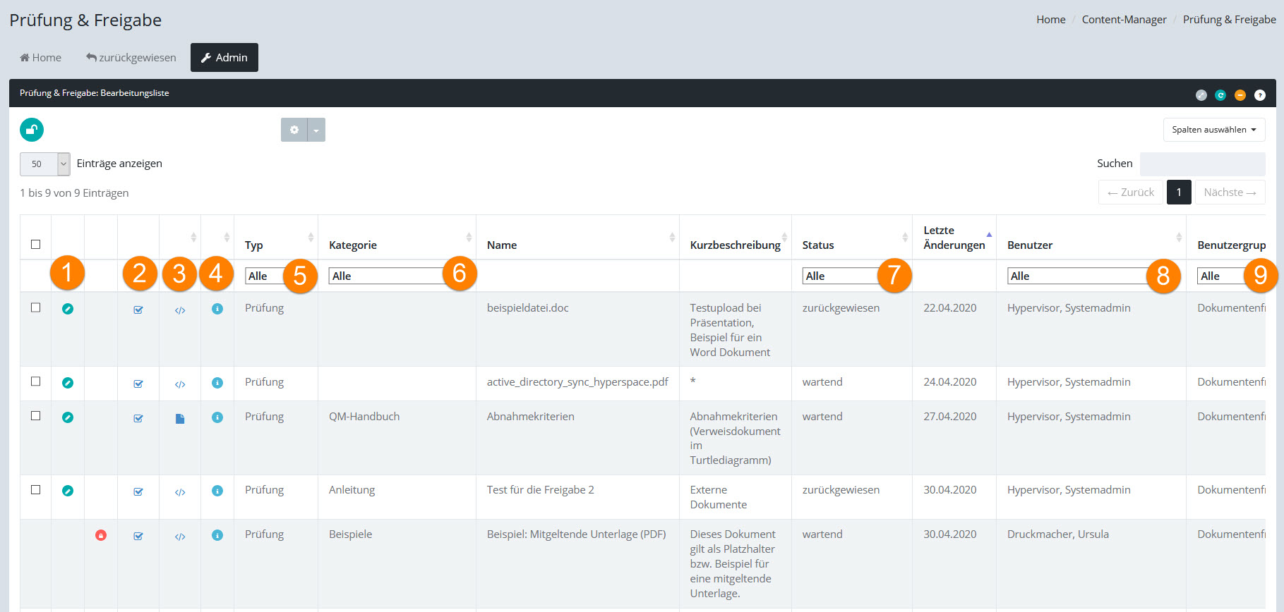 Die Bearbeitungsliste "Prüfung & Freigabe" enthält alle Freigaben und Prüfungen, die der Benutzer durchführen muss: