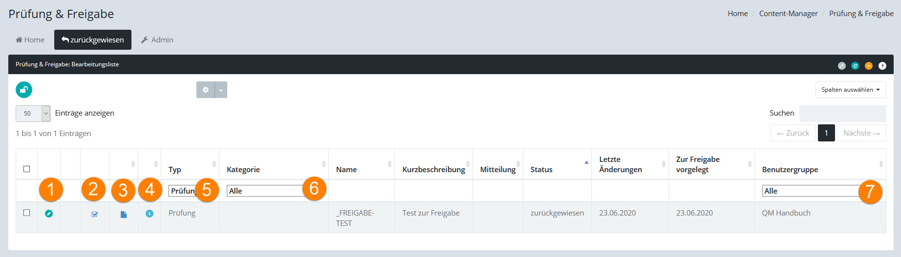 5.Filtermöglichkeit nach "Typ" des zuletzt durchgeführten Prozess-Schrittes (Prüfung, Freigabe)