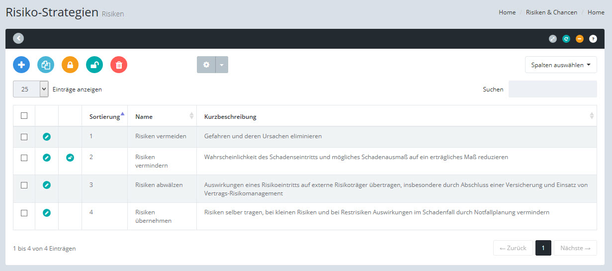 Mit der Bearbeitungsliste können Sie Risiko-Strategien anlegen, bearbeiten und löschen.