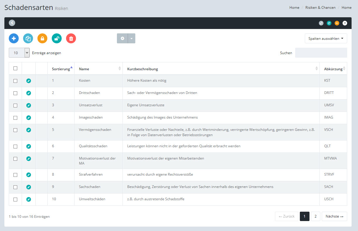 Mit der Bearbeitungsliste können Sie Schadensarten anlegen, bearbeiten und löschen.