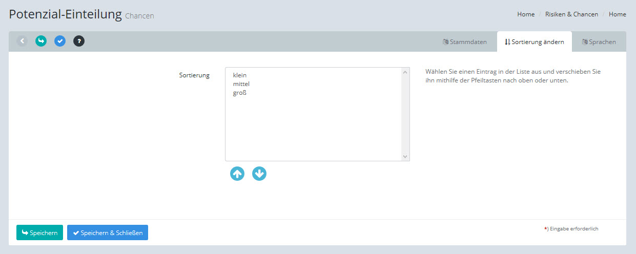 In diesem Bildschirm können Sie die Sortierung der Potenzial-Einteilungen ändern.