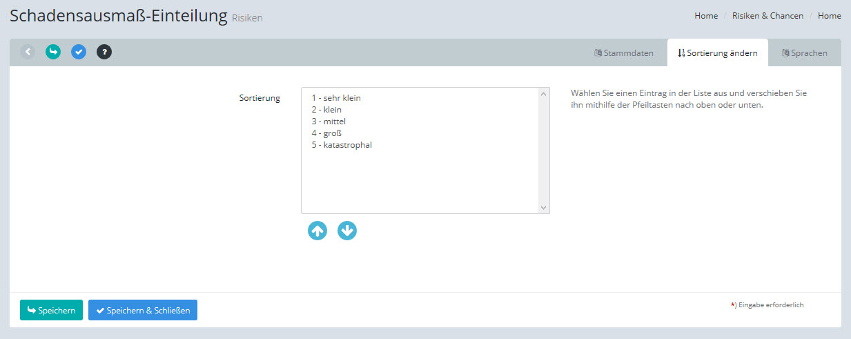 In diesem Bildschirm können Sie die Sortierung der Schadensausmaß-Einteilungen ändern.