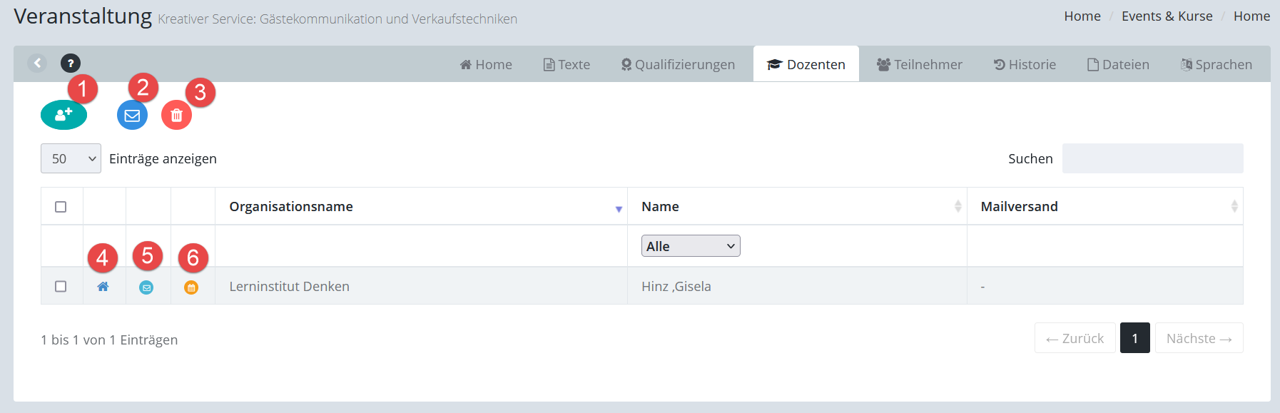 Hier werden die Dozewnten angezeigt, die der Veranstaltung zugewiesen sind.