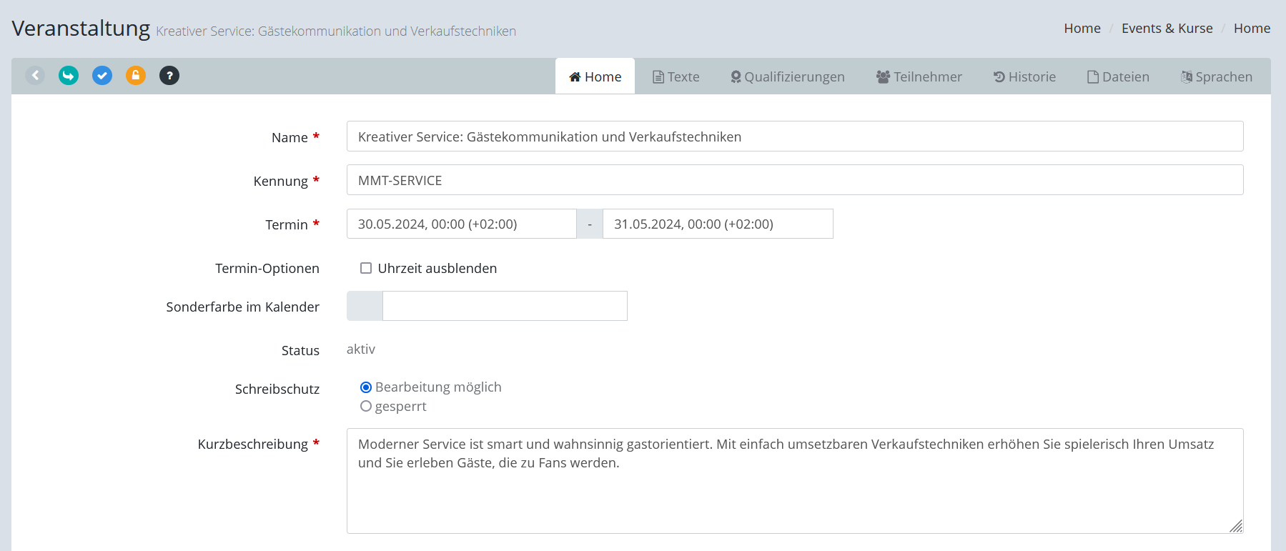 Keine Qualifizierung möglich: Wenn Sie diese Option aktivieren, wird die Registerkarte "Qualifizierungen" ausgeblendet, und die Teilnehmer erwerben durch die Teilnahme keinerlei Qualifizierung (z.B. bei Besprechungen, Sitzungen, etc.) |