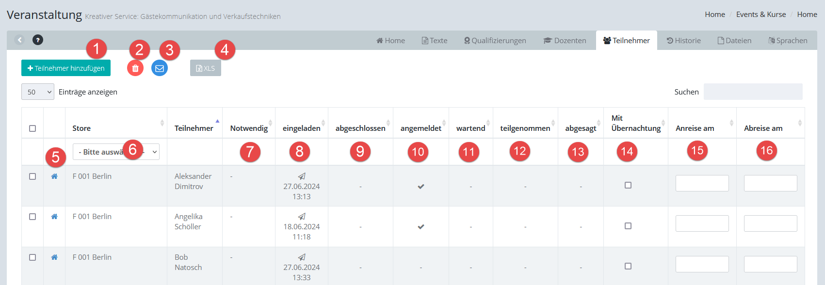 9.Status"Abgeschlossen": Der Teilnehmer hat teilgenommen und die damit verbundene Qualifizierung erworben. Muss nach der Veranstaltung hier manuell gesetzt werden!