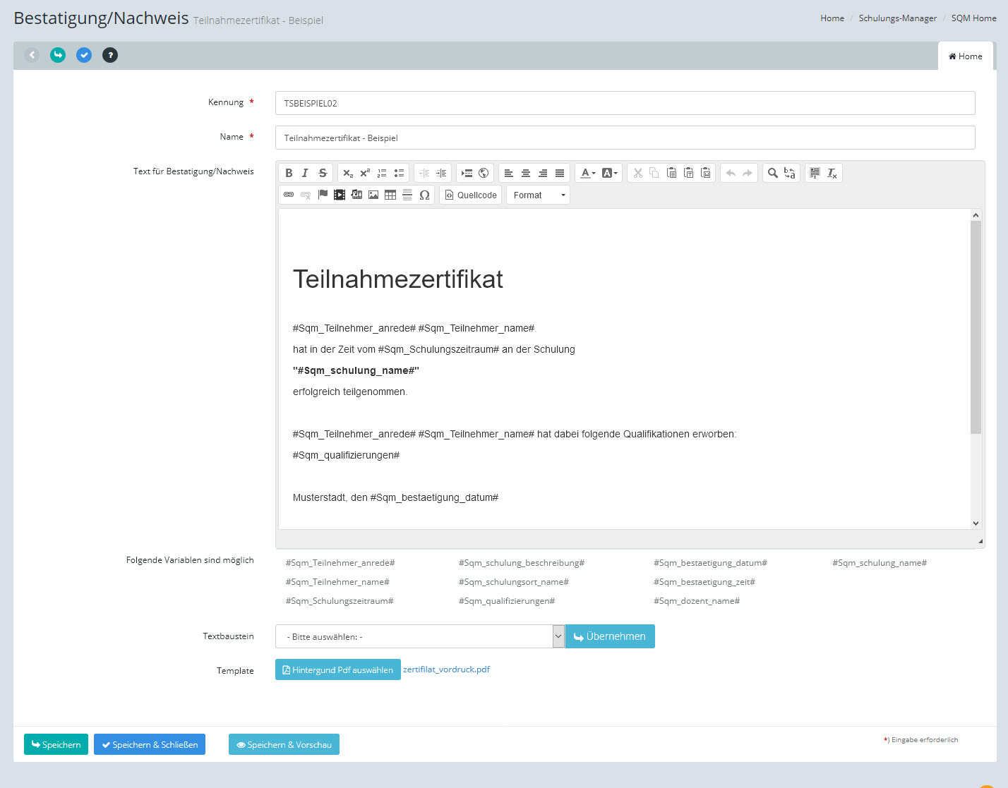 Geben Sie hier den Text für das Teilnahmezertifikat ein. Sie können den Text formatieren und ausrichten sowie Variablen für Platzhaltertext verwenden. Die möglichen Variablen werden unter dem Editorfenster aufgelistet: #Sqm_Teilnehmer_anrede#: Anrede des Teilnehmers #Sqm_Teilnehmer_name#: Name des Teilnehmers #Sqm_schulung_name#; Name der Schulung #Sqm_schulung_beschreibung#: Kurzbeschreibung der Schulung #Sqm_Schulungszeitraum#: Zeitraum der Schulung #Sqm_schulungsort_name#: Name des Schulungsortes #Sqm_qualifizierungen#: Erworbene Qualifizierungen, erscheint automatisch als kommagetrennte Liste #Sqm_bestaetigung_datum#: Datum, an dem der Dozent die erfolgreiche Teilnahme bzw. den Erwerb der Qualifikation bestätigt hat #Sqm_bestaetigung_zeit#: Uhrzeit der Bestätigung durch den Dozenten #Sqm_dozent_name#: Name des Dozenten |