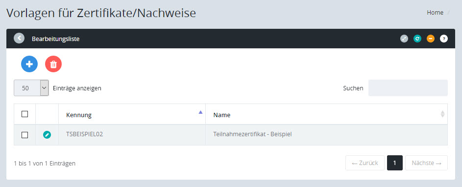 Mit der Anwendung "Vorlagen für Zertifikate/Nachweise" können Sie das Aussehen und den Text für Teilnahmezertifikate und Schulungsnachweise festlegen.