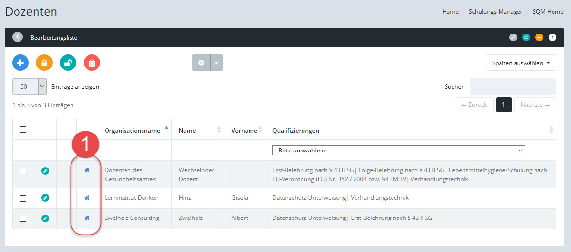 Die Speicherung der Dozenten erfolgt im hyCRM Kontaktmanager, zusätzlich können die Dozenten aber auch direkt im SQM-Schulungsmanager bearbeitet werden.