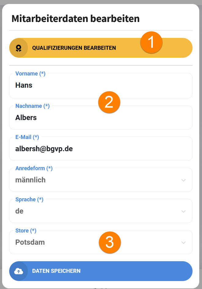1.Springt zu den Qualifizierungen des Mitarbeiters, um Qualifizierungen zu erneuern, zu erwerben oder zu dokumentieren. Mehr dazu auf der Hilfeseite "Qualifizierungsmanagement"