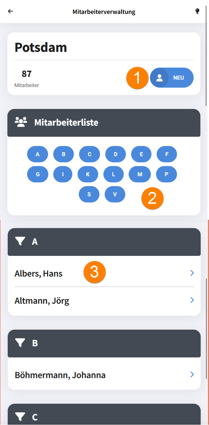 2.ABC-Register: Klick auf einen Buchstaben springt zur Liste der Mitarbeiter, deren Nachnamen mit diesem Buchstaben beginnt