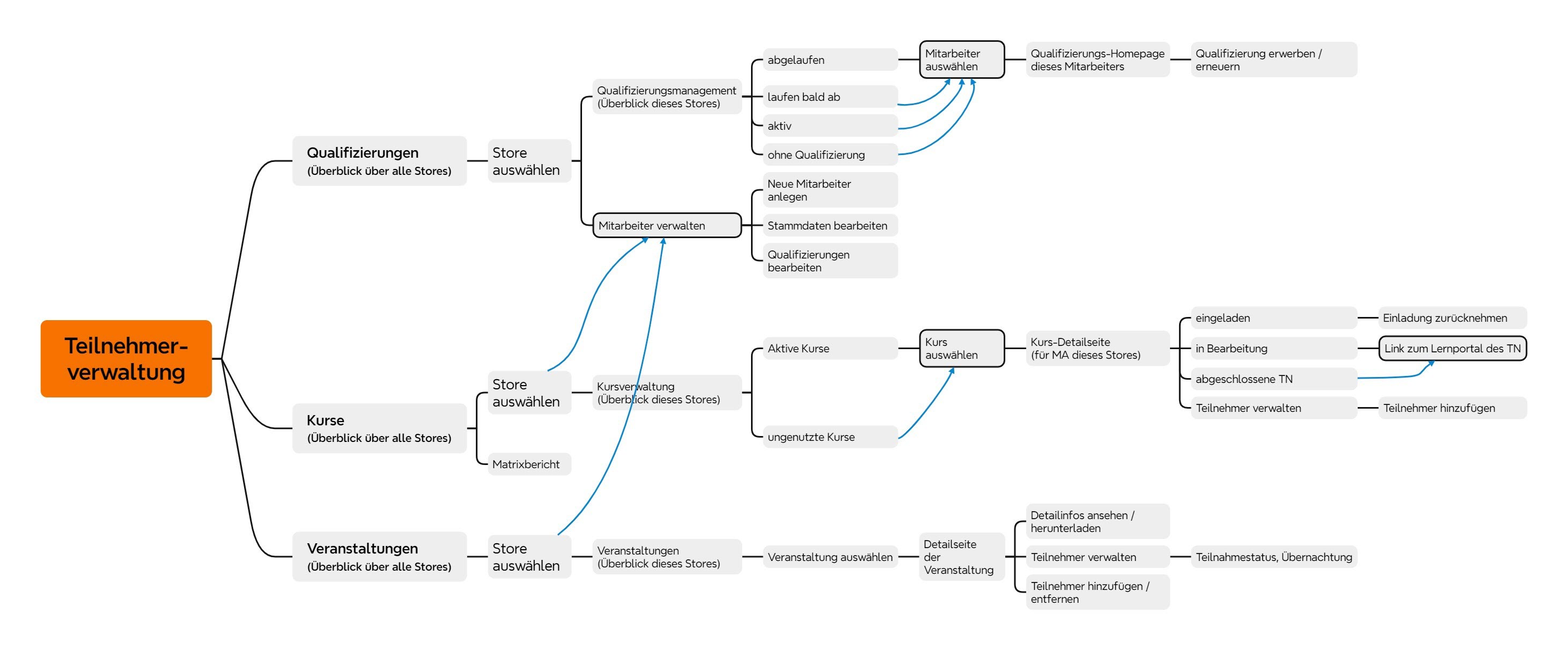 Hier kann man für alle Stores, für die man SQM-Admin-Berechtigungen besitzt, die Qualifizierungen, Kurse und Veranstaltungen aller Mitarbeiter / Teilnehmer verwalten: