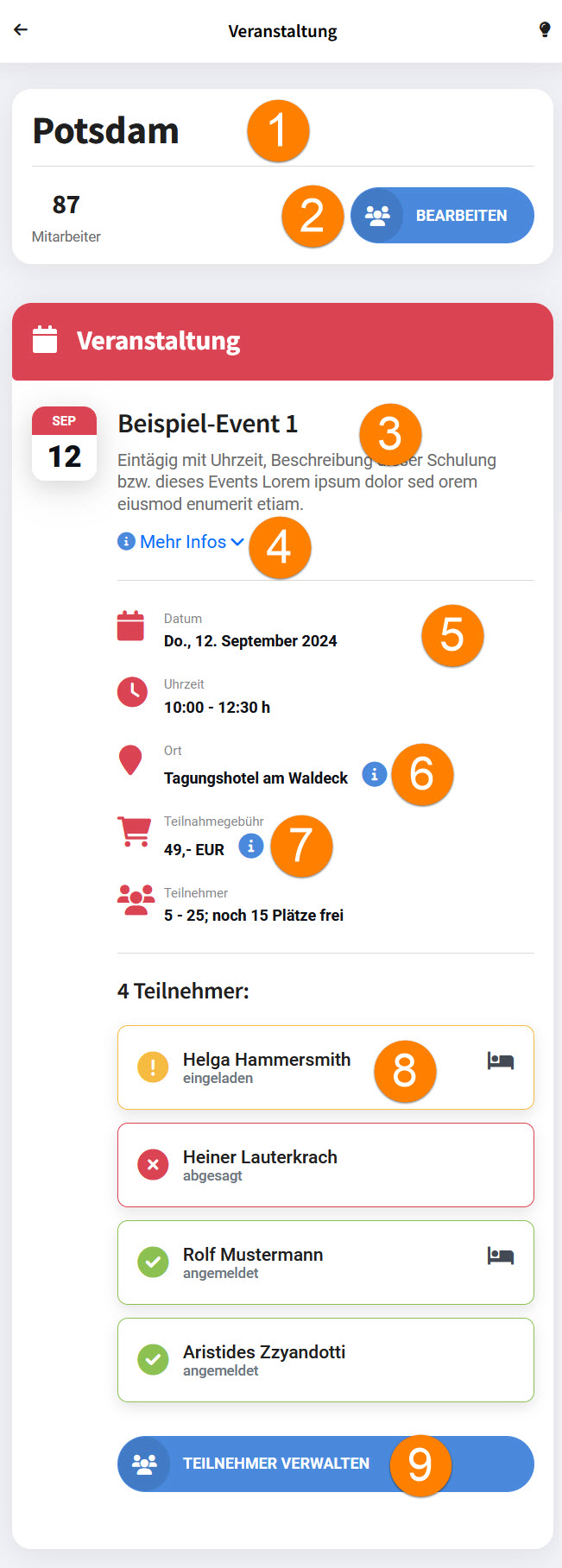 8.In der Teilnehmerliste sehen Sie die Mitarbeiter, die an der Veranstaltung teilnehmen sollen. Der Status (eingeladen, angemeldet, abgesagt) wird ebenso angezeigt wie ein Übernachtungswunsch (Bett-Icon).