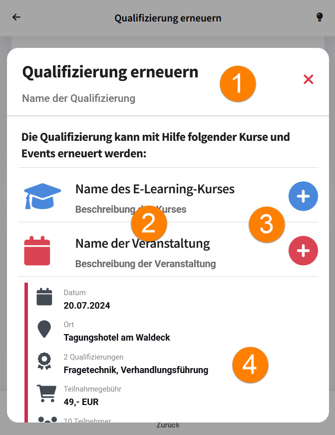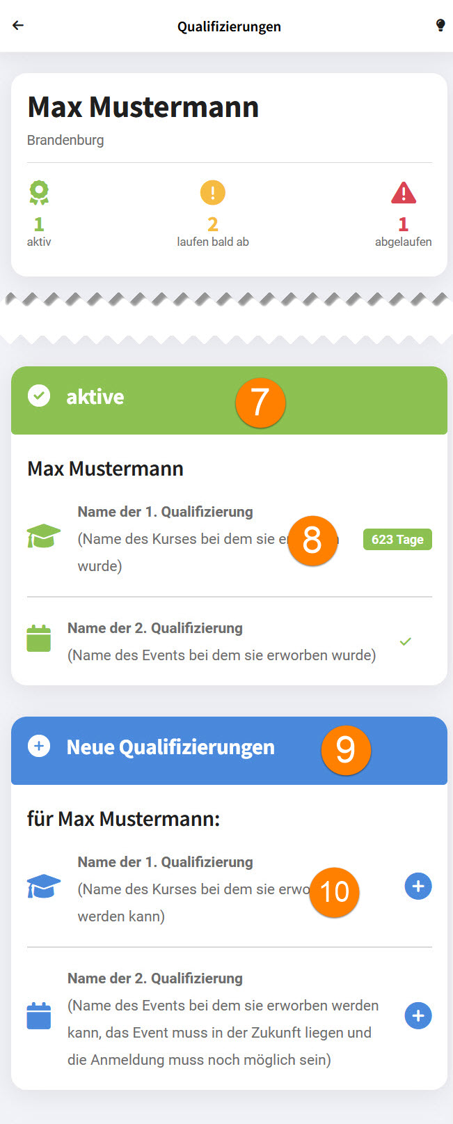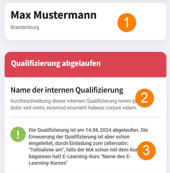 3.Hinweistext wird angezeigt, falls die Qualifizierung abgelaufen ist, die Erneuerung aber bereits veranlasst wurde, z.B. durch Teilnahme an einem Kurs, der zwar begonnen, aber noch nicht abgeschlossen wurde.