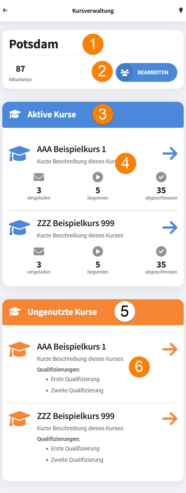 4.Für jeden Kurs wird hier angezeigt: Name und Beschreibung des Kurses, Anzahl der eingeladenen Teilnehmer, Anzahl der Teilnehmer, die dieses Kurs gerade bearbeiten und die Anzahl der Teilnehmer, die diesen Kurs bereits abgeschlossen haben.