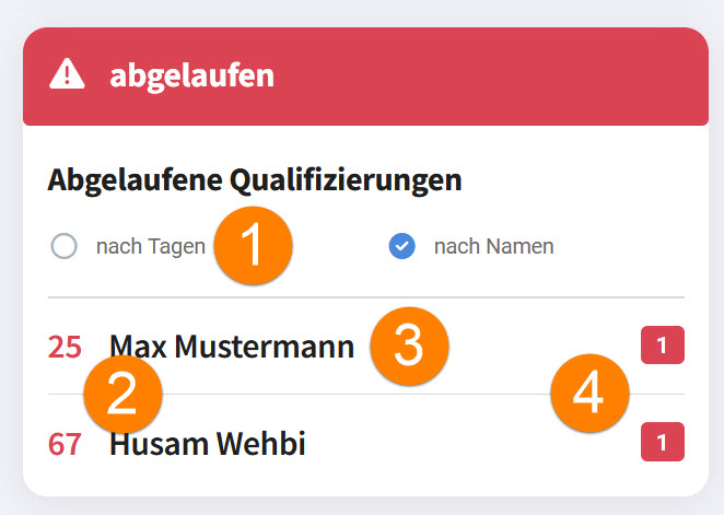 2.Die linke, große Zahl zeigt die restlichen Tage bis zum Ablauf der Qualifizierung an. Falls es für einen Mitarbeiter mehrere abgelaufene Qualifizierungen gibt, wird die höchste Anzahl der abgelaufenen Tage hier angezeigt.