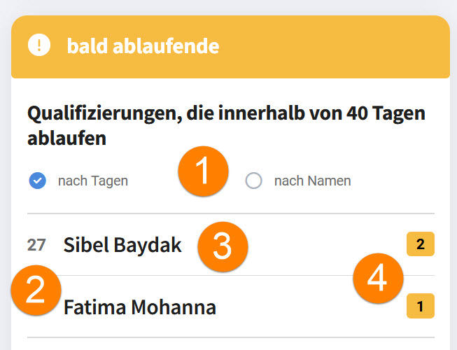 4.Die rechte, kleine Zahl zeigt die Anzahl der bald ablaufenden Qualifizierungen dieses Mitarbeiters an