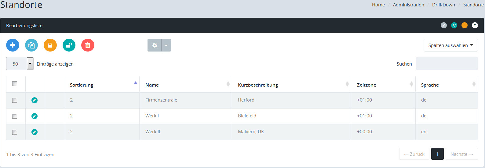 Mit der Bearbeitungsliste können Sie Standorte bearbeiten oder neue anlegen.