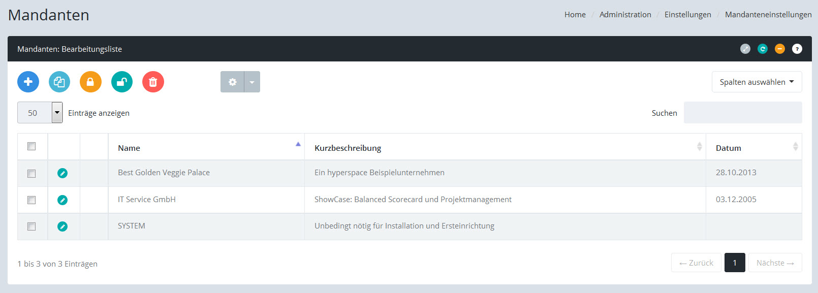 Über diese Bearbeitungsliste können die vorhandenen Mandaten verwaltet oder Neue angelegt werden.