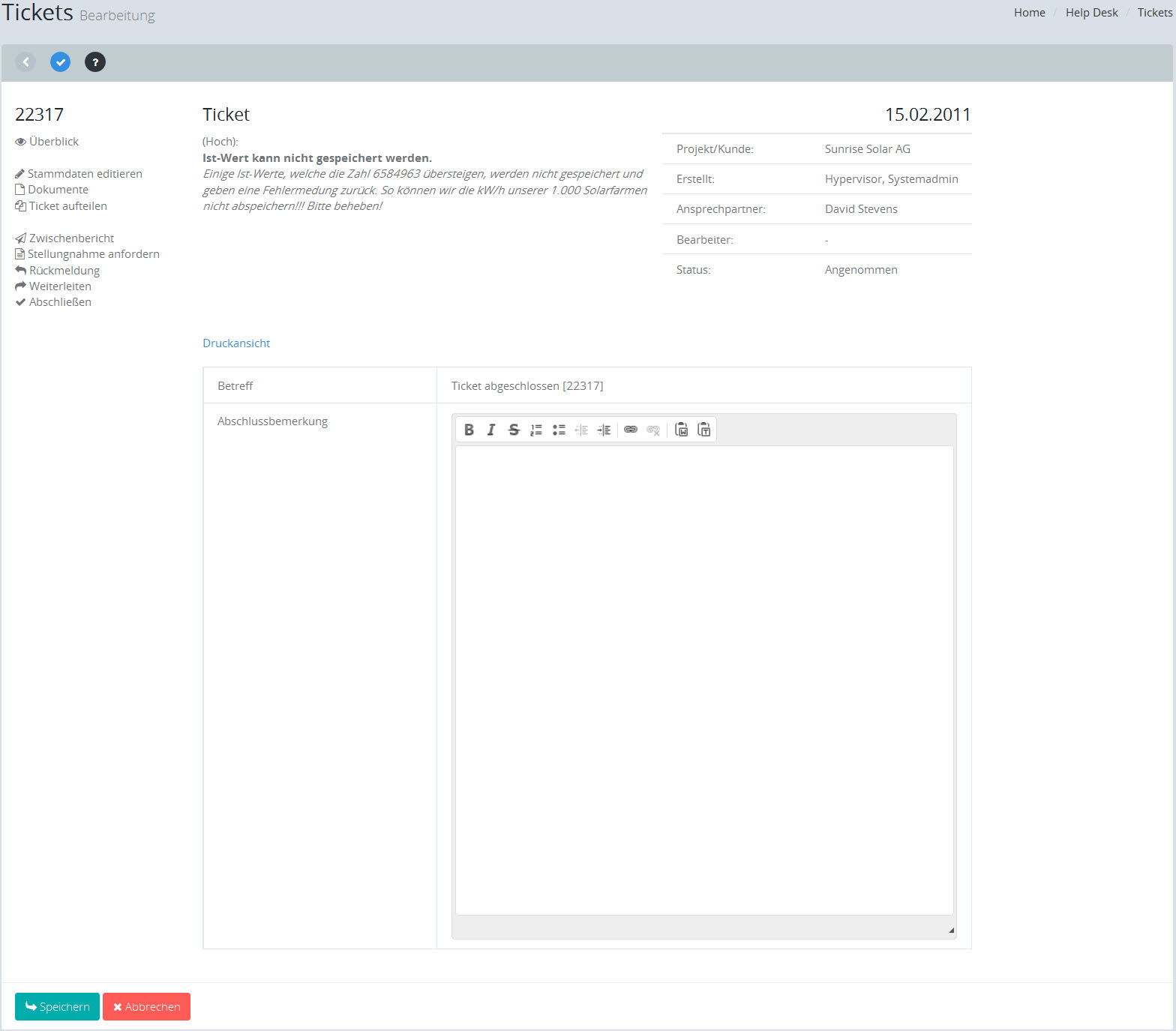 Zeigt die Eingabemaske zum Abschließen eines Tickets