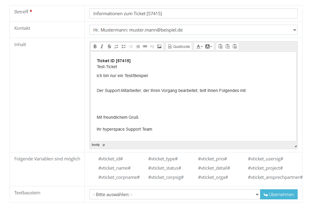 Zeigt den Betreff der Email, welche an die Kontaktperson gesendet wird. |