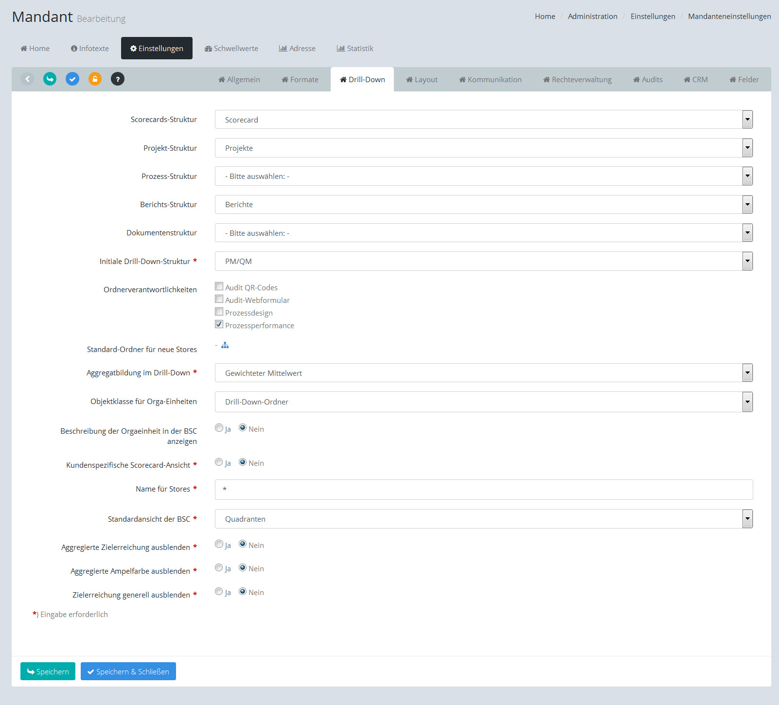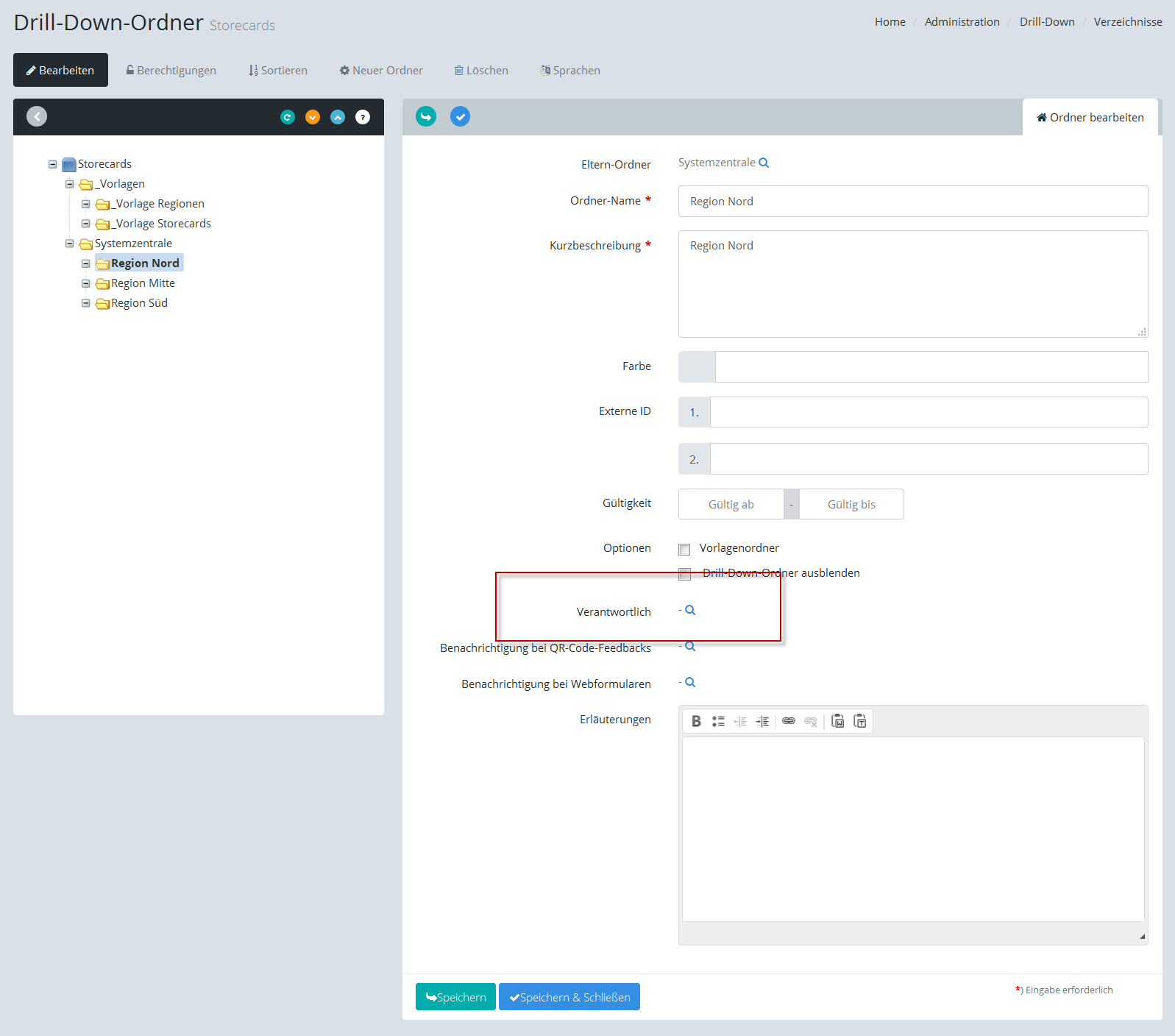 Beim Bearbeiten von Drilldown-Ordnern können Sie die Verantwortlichkeiten festlegen, die zuvor beim Mandanten freigeschaltet worden sind.