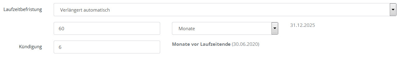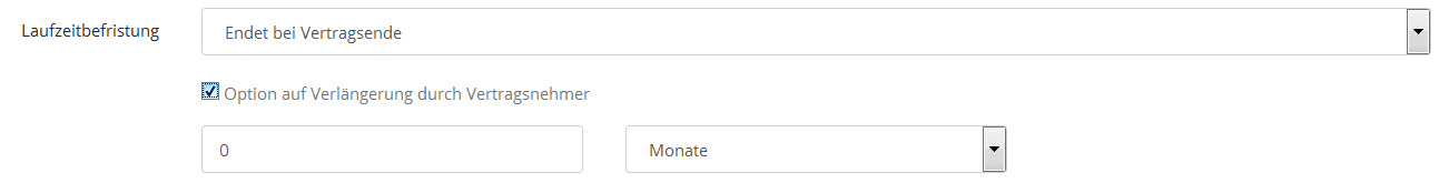 Endet bei Vertragsende Wenn diese Option aktiv ist, können Sie zusätzlich "Option auf Verlängerungen durch Vertragsnehmer" ankreuzen und die entsprechende Frist eingeben.