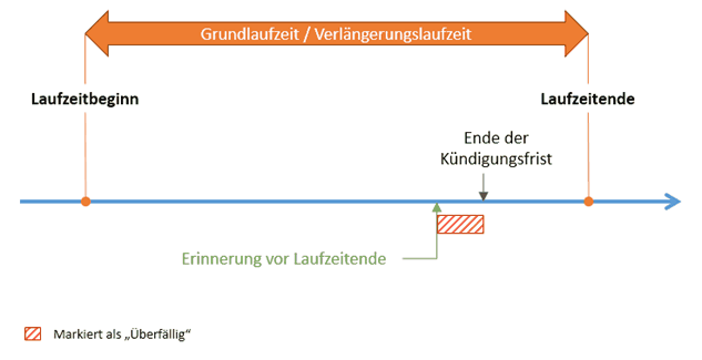 •Automatische Verlängerung: Bei Verträgen, bei denen die Option „Automatische Verlängerung“ gewählt ist, werden die Datumsangaben für Laufzeitende, Erinnerungsdatum, etc. automatisch aktualisiert, sobald das Laufzeitende erreicht ist.