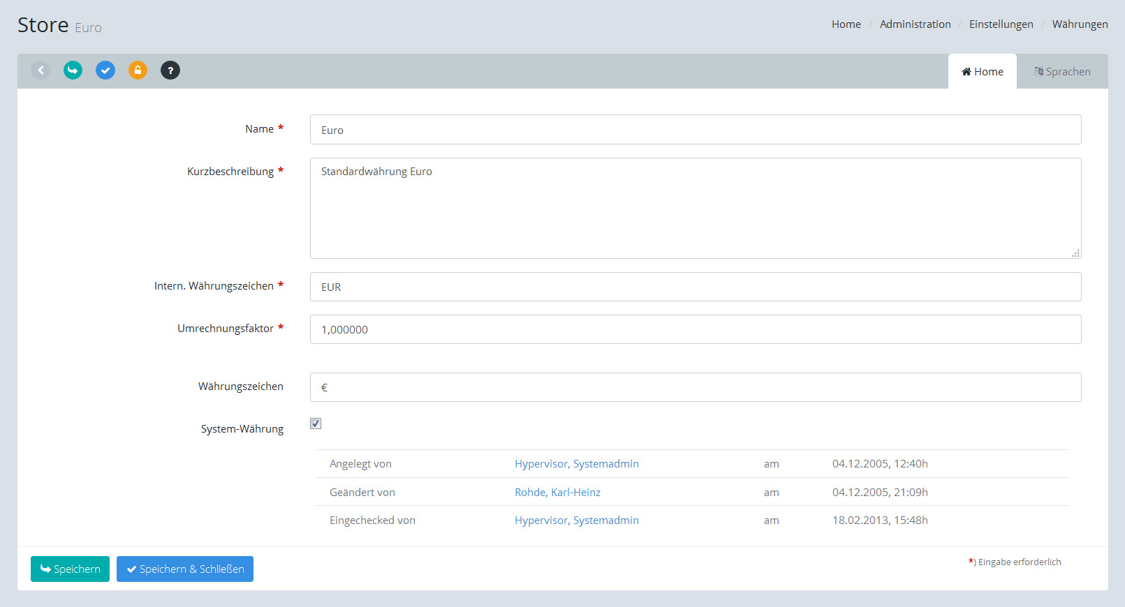 Eine Währung kann die Systemwährung sein, die Systemwährung wird in den Auswahllisten als Standardvorgabe benutzt. |