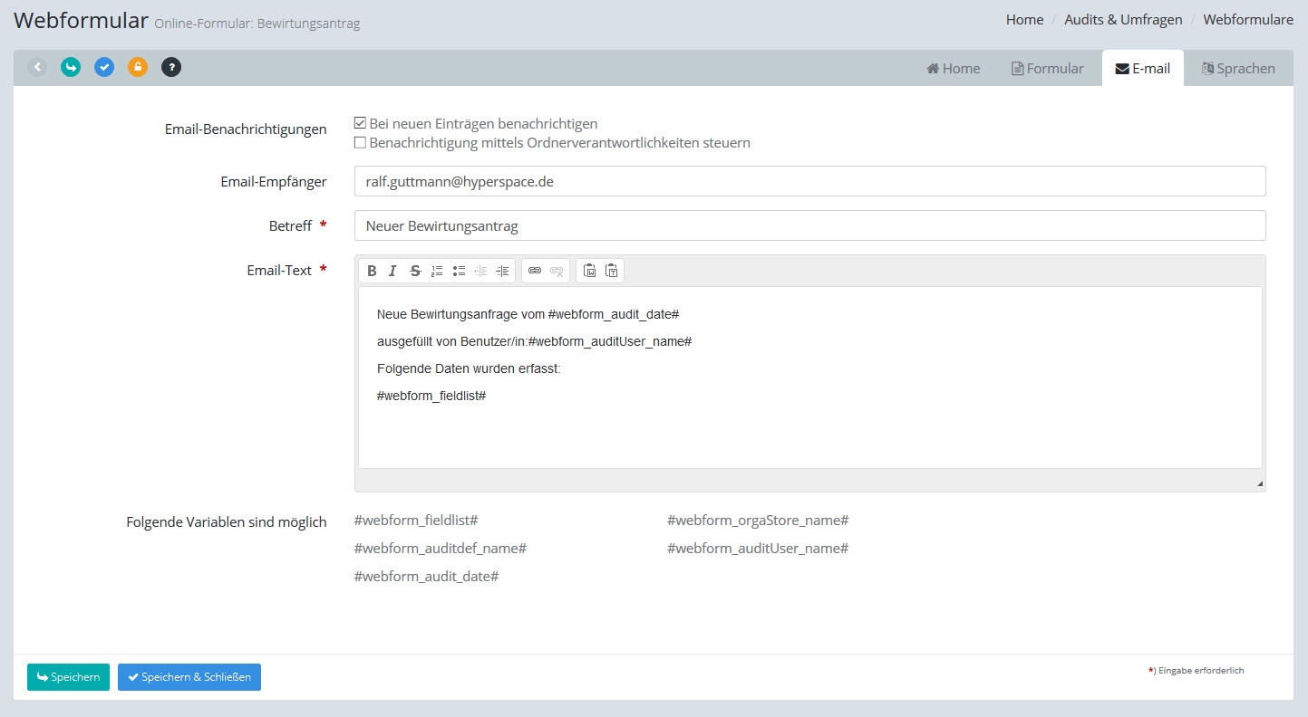 •Email-Text: Textinhalt der Email-Nachricht über neue Einträge. Dabei können folgende Variablen benutzt werden: