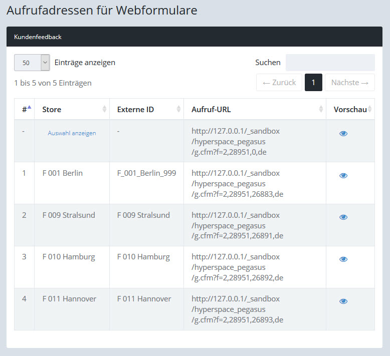 Durch Klick auf das Vorschau-Icon können Sie das Webformular für den jeweiligen Standort ausprobieren.
