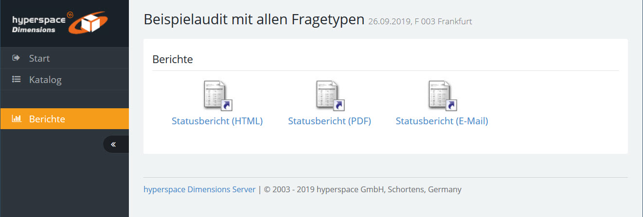 Mit dem Menüpunkt "Berichte" können Sie den Statusbericht des Audits in HTML oder als PDF erstellen oder per E-Mail oder Fax versenden.