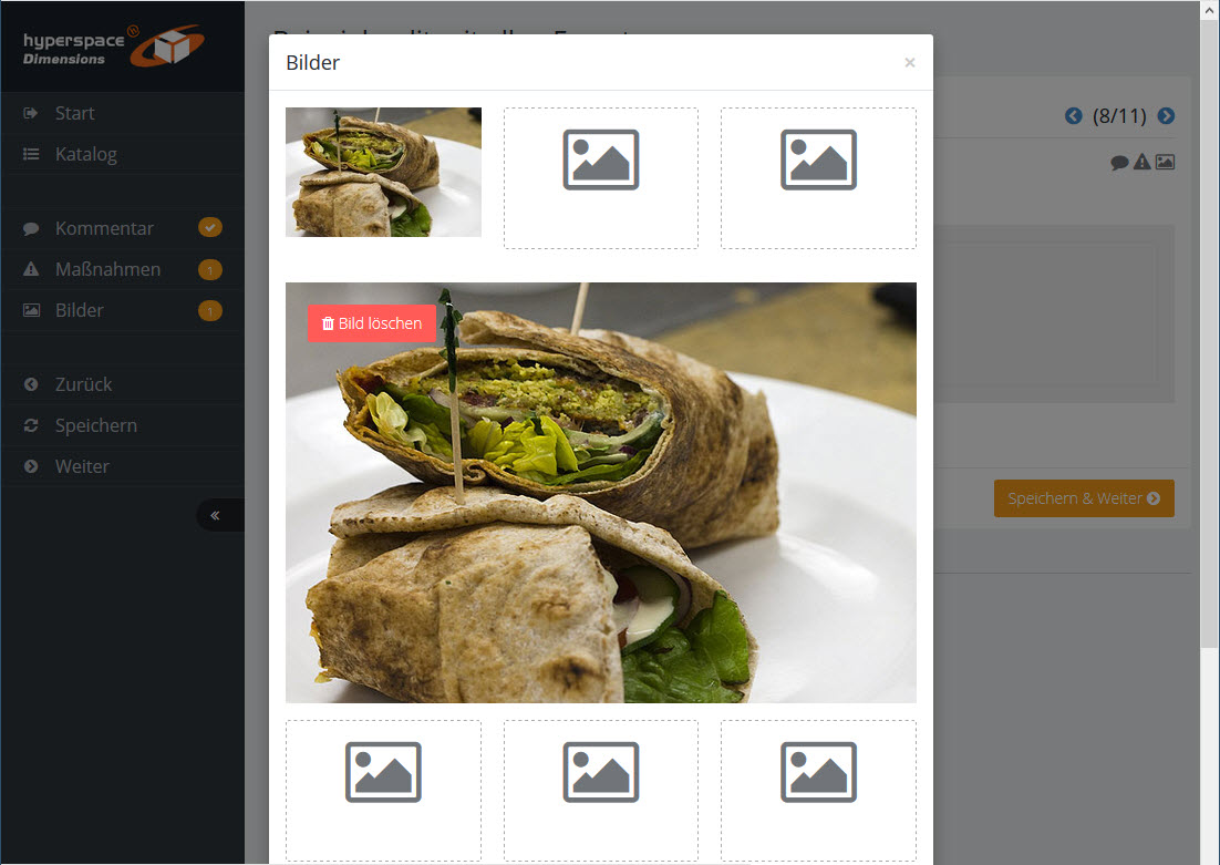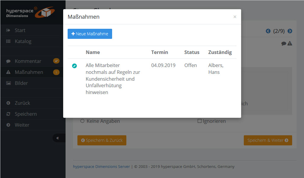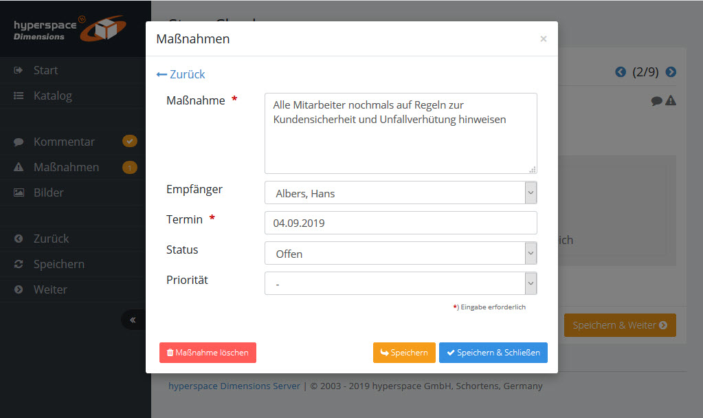 Mit dem linken Menü können Sie innerhalb des Audits navigieren und Kommentare, Maßnahmen und Bilder zur Frageposition erfassen.