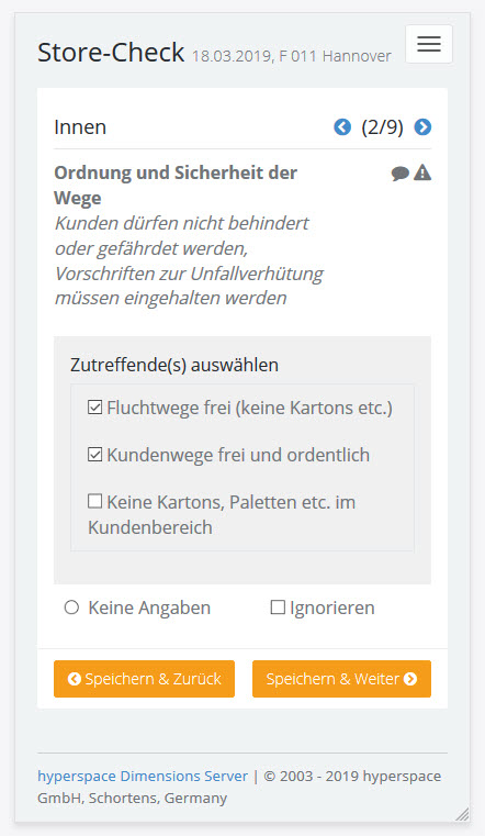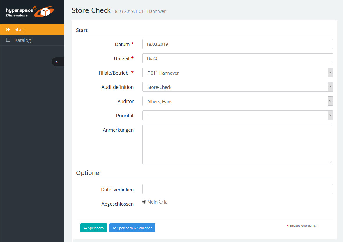 Hier geben Sie die Stammdaten des Audits ein: Datum, Uhrzeit, Store/Orgaeinheit, Auditor etc.