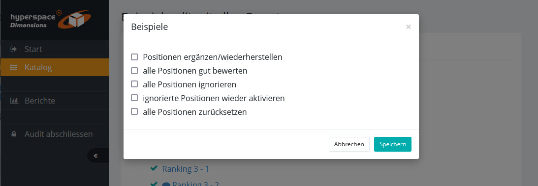 Wenn Sie beim Anlegen eines Audits einen Themenbereich ausgeklammert haben, wurden die zugehörigen Fragepositionen nicht angelegt. Mit der Option "Positionen ergänzen/wiederherstellen" können Sie die fehlenden Fragepositionen nachträglich hinzufügen.