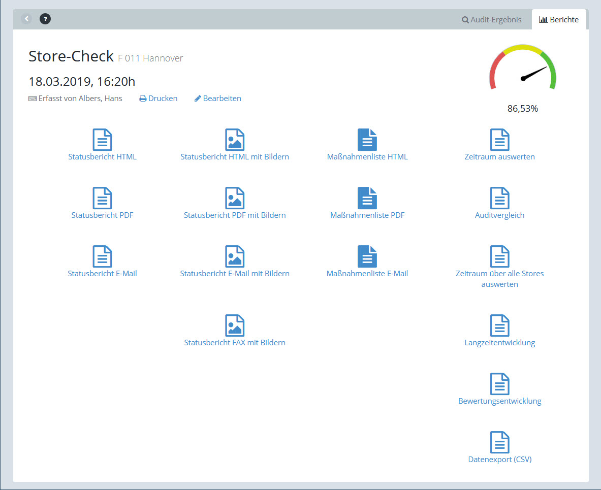 2.Darüber hinaus gibt es weitere Berichte und Auswertungen, sowie einen Datenexport aller Audits dieser Auditdefinition für den aktuellen Store ("Datenexport (CSV)")