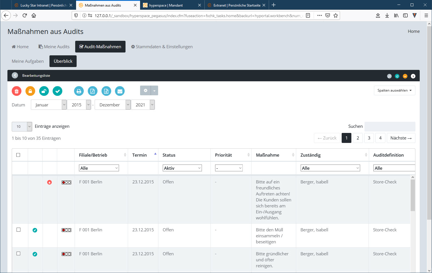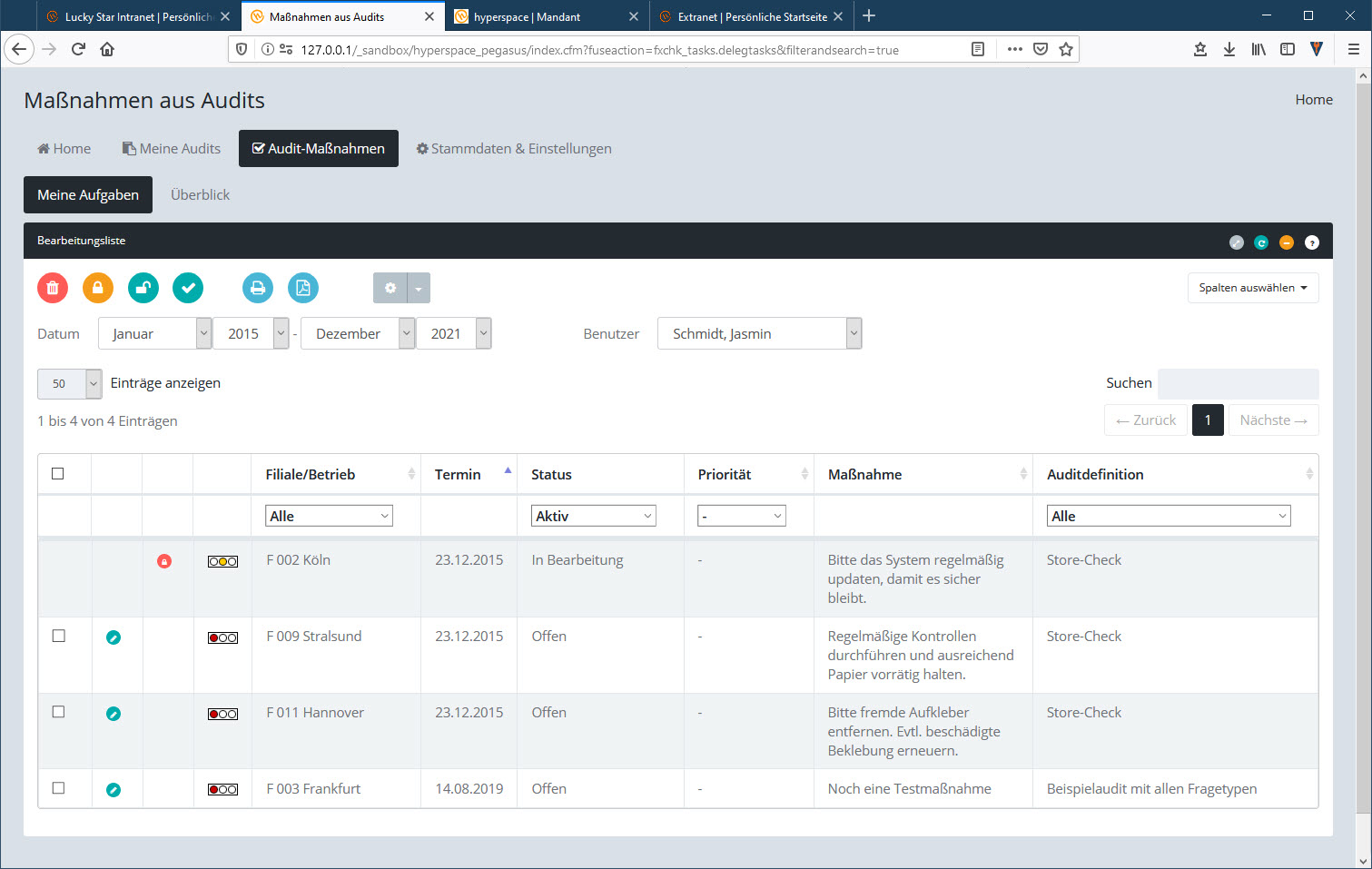 Diese Registerkarte zeigt alle Maßnahmen an, die zu den Audits gehören, die man bearbeiten darf.