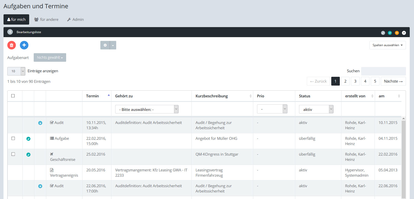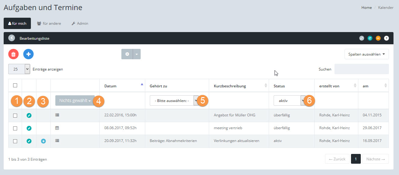 Die Liste "Aufgaben und Termine" zeigt alle Aufgaben und Termine an, die der aktuelle Benutzer bearbeiten muss oder die er für andere angelegt hat.