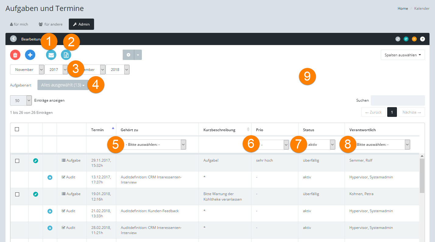 Diese Ansicht steht nur für Administratoren zur Verfügung. Sie enthält die Aufgaben und Termine aller Benutzer.