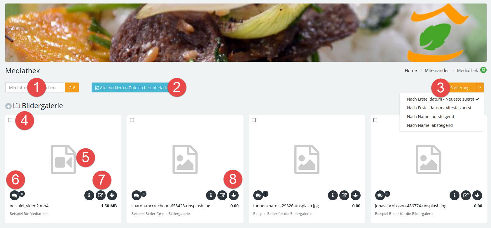 Die Mediathek zeigt die Bild- und Mediendateien eines Ordners als Kacheln an.
