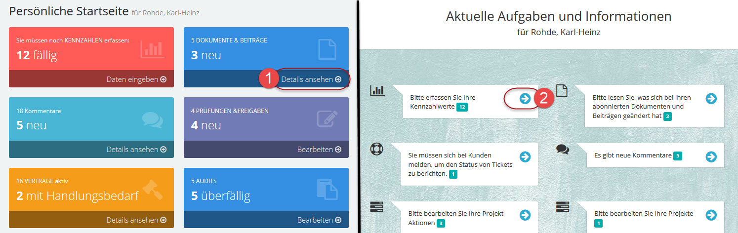 Klicken Sie in der Info-Kachel auf "Details ansehen" (Lucky-Star, 1) bzw. den blauen Pfeil (Paperclip, 2), um auf die entsprechende Anwendung oder Informationen zuzugreifen: