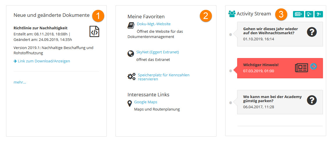 Die persönliche Startseite gibt Ihnen direkten Zugriff auf News, aktuelle Aufgaben, geänderte Dokumente und Ihre Favoriten: