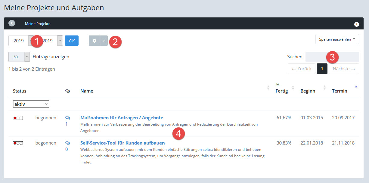 4.Anzeige der Projekte, die Liste kann nach dem Projektstatus (aktiv, abgeschlossen, überfällig, ...) gefiltert und nach allen Spalten sortiert werden.