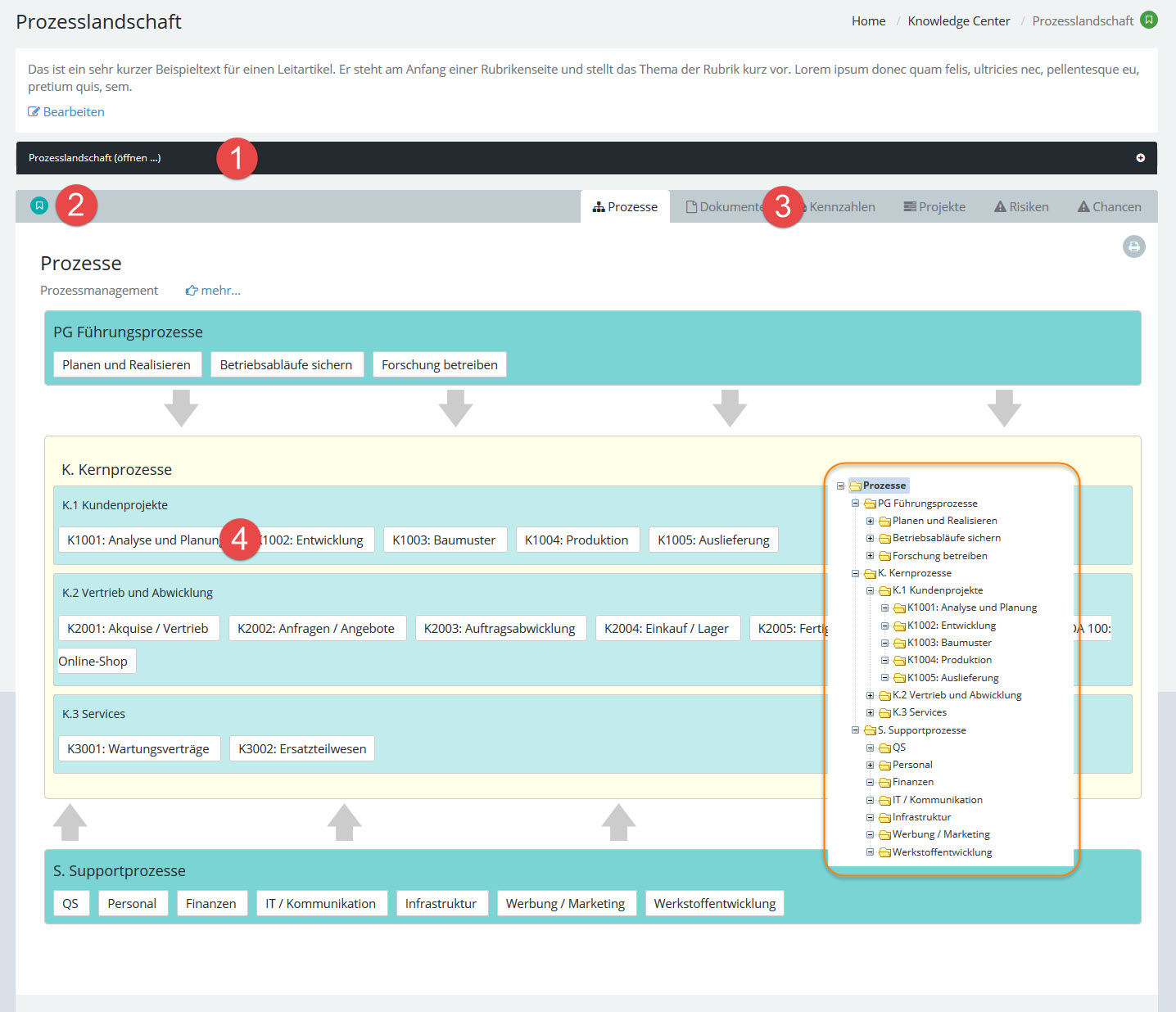 Die Prozesslandkarte zeigt den hierarchisch gegliederten Baum der Prozesse als Landkarte mit drei Bereichen an: