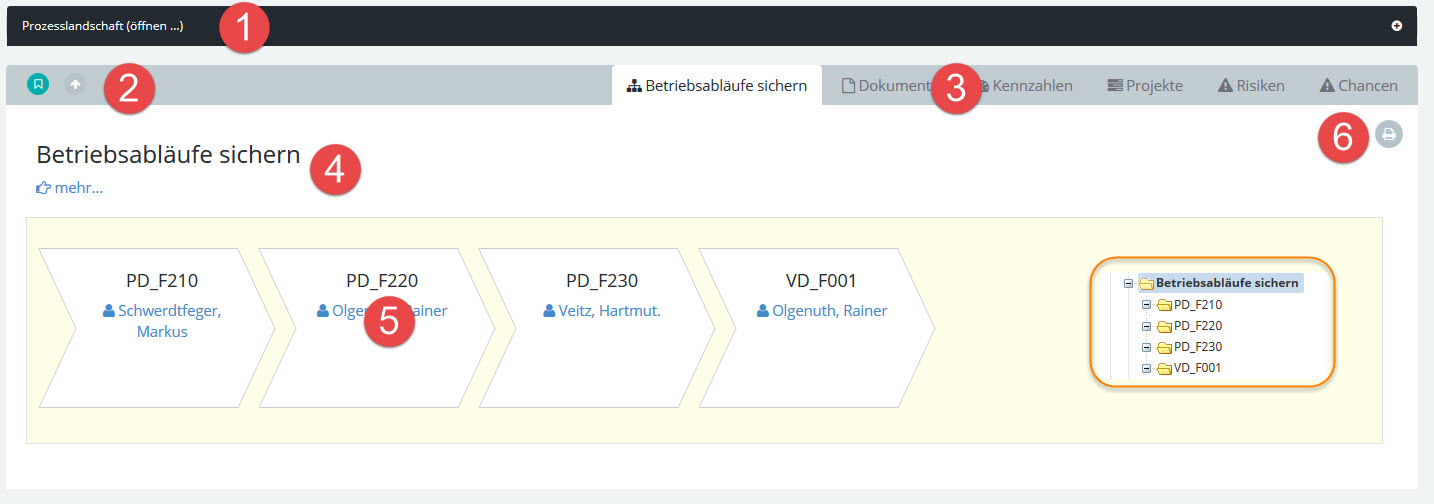 3.Weitere Registerkarten zeigen Ihnen die Dokumente, Kennzahlen, Projekte, Risiken und Chancen zum aktuellen Prozess an