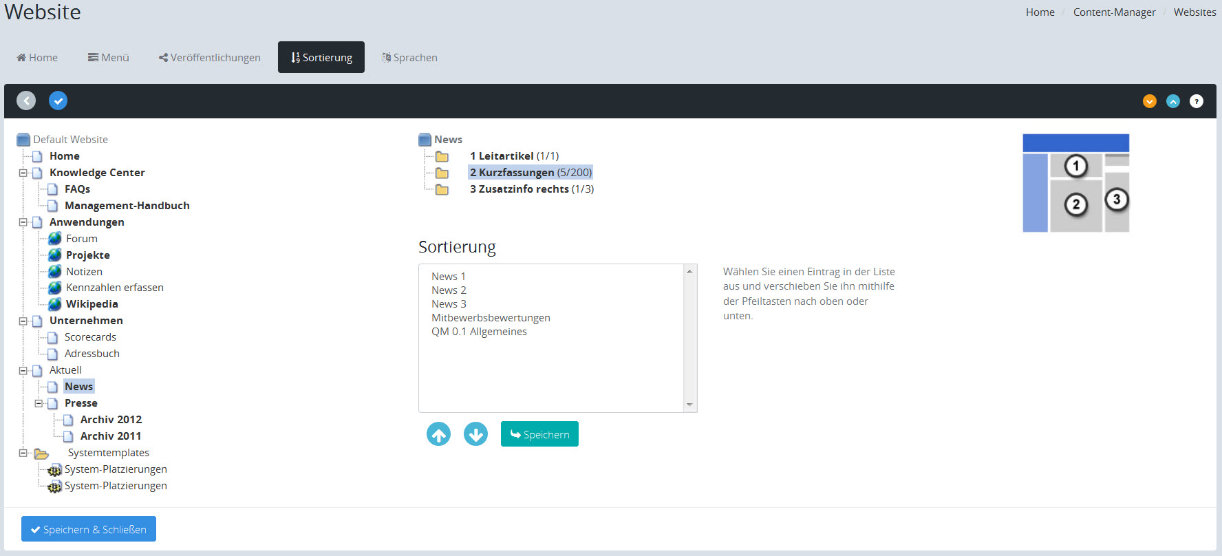 Sie können mit der Sortierung die Reihenfolge der Artikelplatzierungen in den jeweiligen Website-Bereichen mithilfe der Schaltflächen mit den Pfeil-Symbolen ändern.