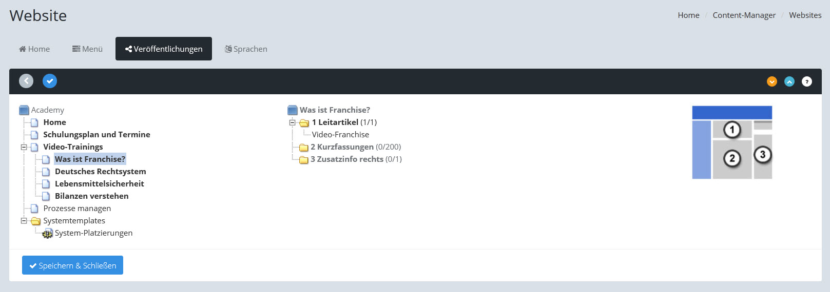 Hierzu einfach im linken Menübaum das zu bearbeitende Menü anklicken. Im rechten Baum werden daraufhin die Abschnitte mit ihren enthaltenen Artikel angezeigt. Um einen Artikel zu entfernen, reicht ein Klick auf den Artikeleintrag aus.