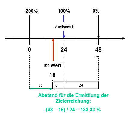 Weniger als 24 muss besser als 100 % sein, der Einfachheit halber legen wir für den Wert 0 eine Zielerreichung von 200% fest.