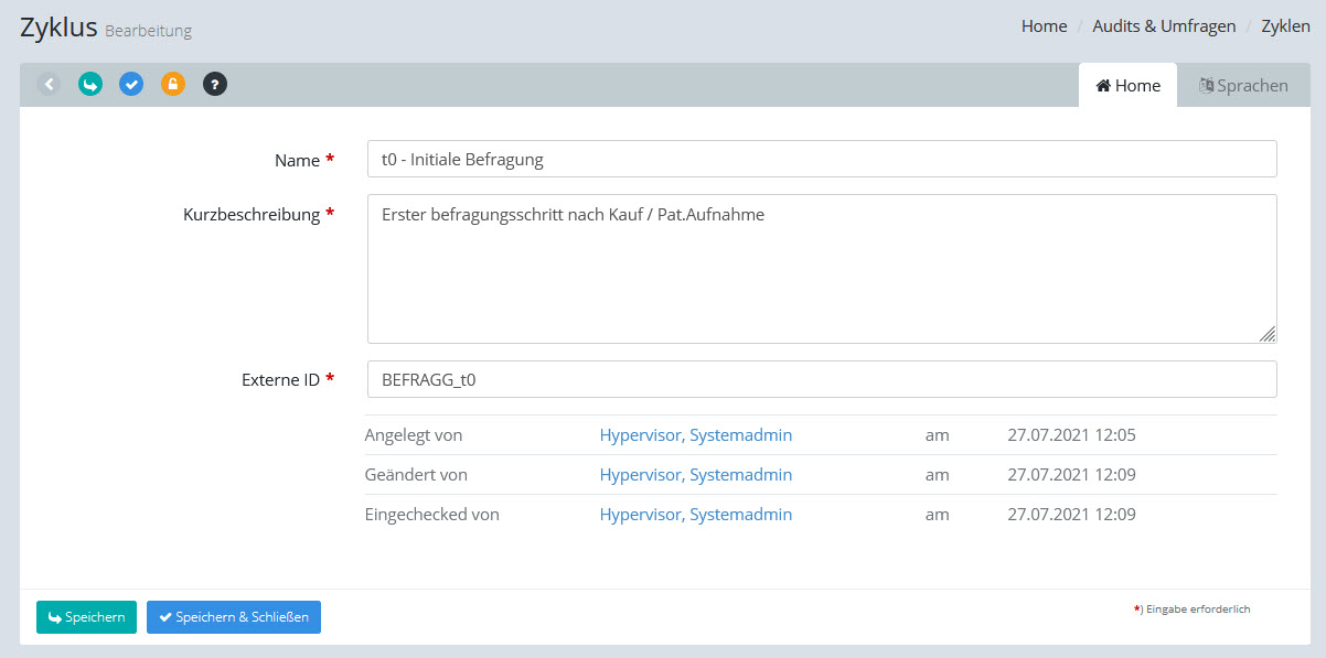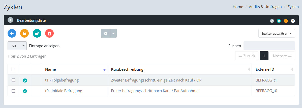 Hierzu müssen zunächst Zyklen angelegt werden, z.B. t0 - Initialbefragung, t1 – Folgebefragung.
